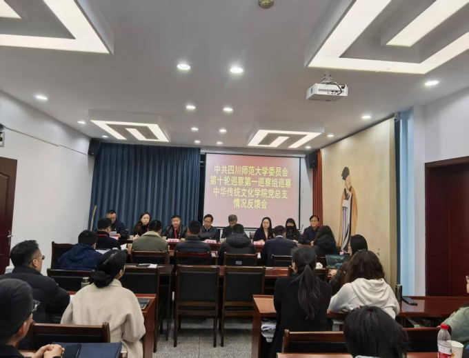 根据学校党委统一部署,2026年3月19日下午,中共四川师范大学委员会第十轮巡察第一巡察组巡察中华传统文化学院党总支情况反馈会在狮子山校区嘤鸣园A103会议室召开。校党委常委、副校长蒋文涛出席会议,党委巡察办公室常务副主任、巡察组组长、巡察工作领导小组成员李华,组织部、纪委办相关同志,第一巡察组全体同志、中华传统文化学院全体教职员工参加会议。会议由中华传统文化学院党总支书记阳家全主持。